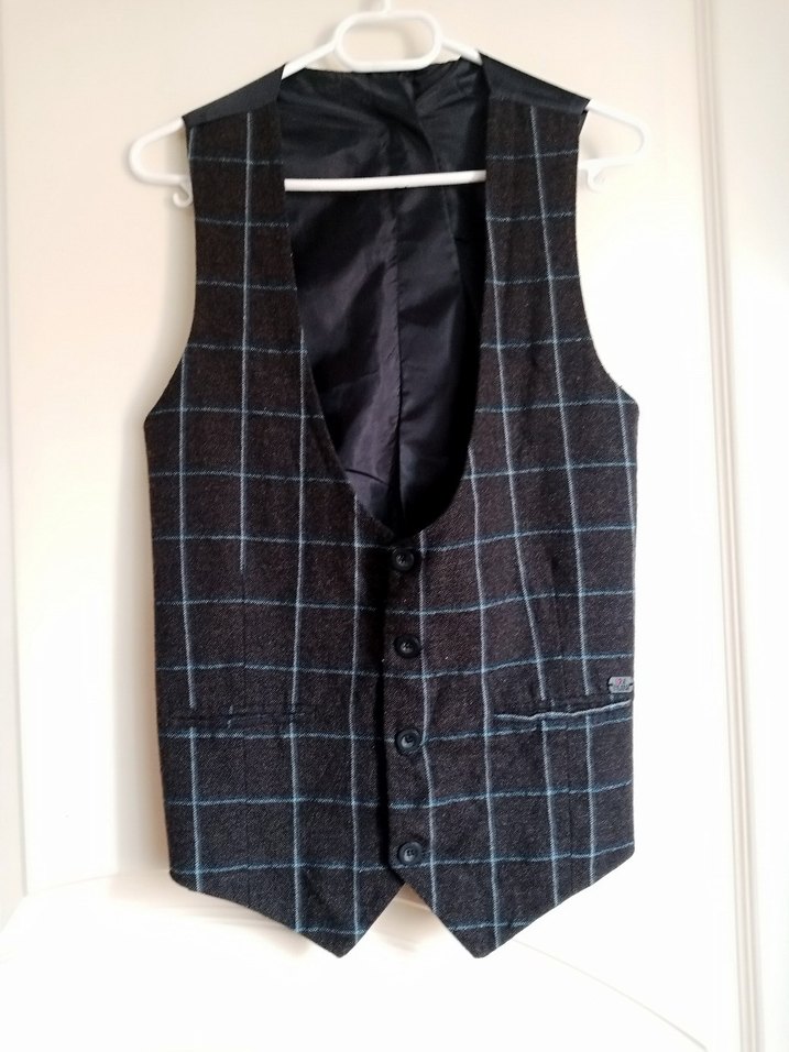 Düğmeli, gri kareli desenli, sentetik kumaştan erkek yeleği. Kolsuz, normal boy ve regular fit kesime sahiptir. Günlük ve iş stiline uygundur.