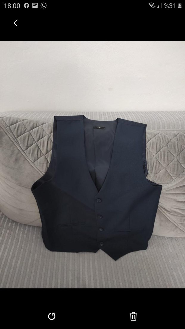 Gri renkte, düğmeli ve kolsuz erkek yeleği. Normal kesim ve suni kumaştan, ofis ve günlük kullanıma uygun.