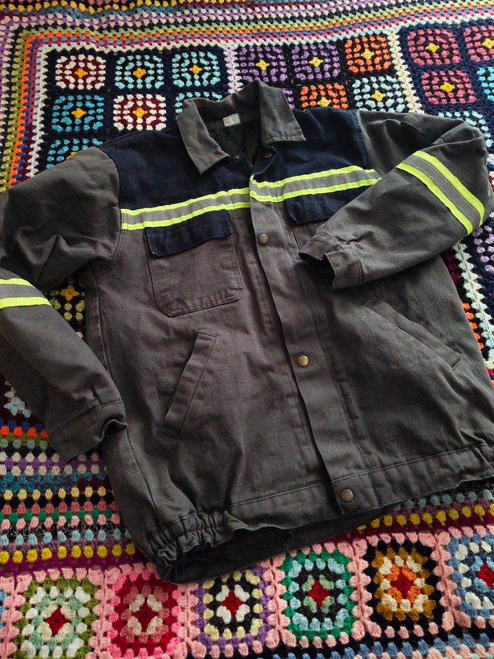 Düğmeli, gri dokuma kumaştan bol kesim erkek ceket. Yansıtıcı şeritler ve ön cepler bulunur, street wear stiline uygundur. takım fiyatı