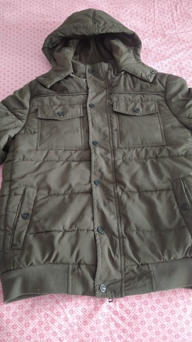 Düğmeli, uzun kollu, kesimli ve midi boyda haki renk erkek mont. Sentetik kumaştan yapılmış, günlük sokak stili için uygundur.
