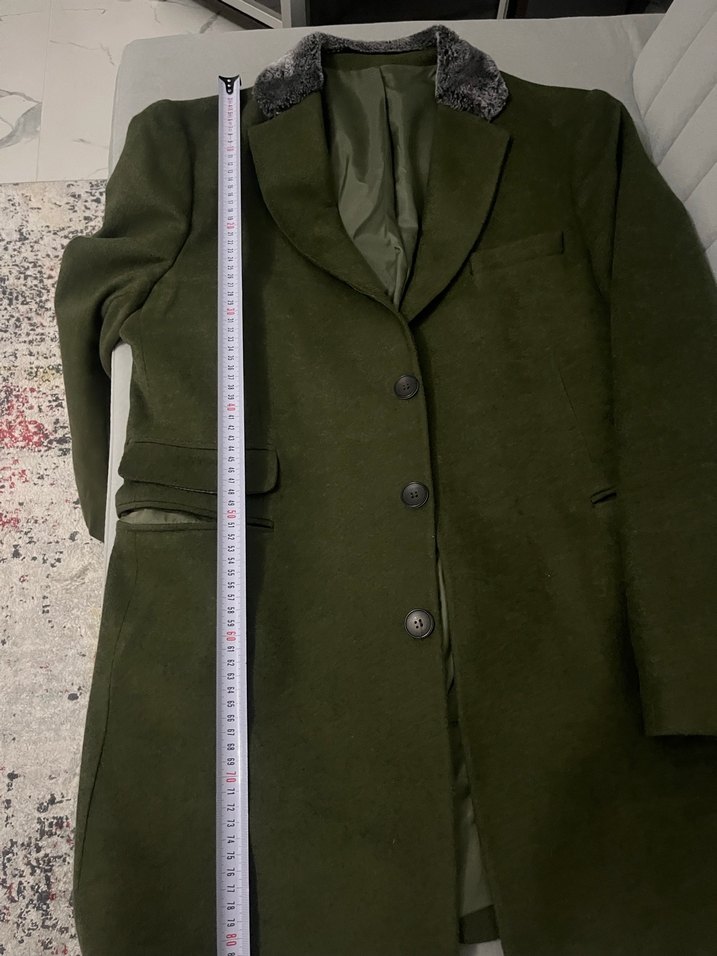 Düğmeli, gri yakalı, midi uzunlukta kaban. Uzun kollu, normal kesim ve yumuşak kumaştan üretilmiştir.