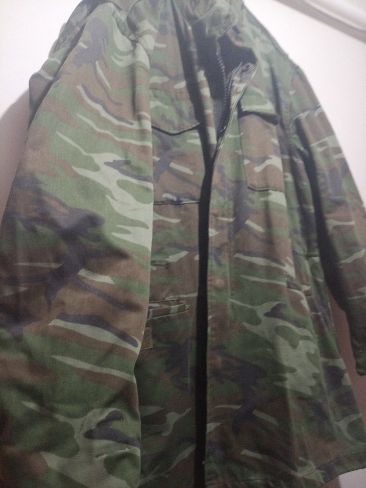 Düğmeli, uzun kollu, normal boy kamuflaj desenli erkek ceket. Sentetik kumaştan, bol kesim ve notlu yaka detaylı, outdoor sokak stiline uygun.