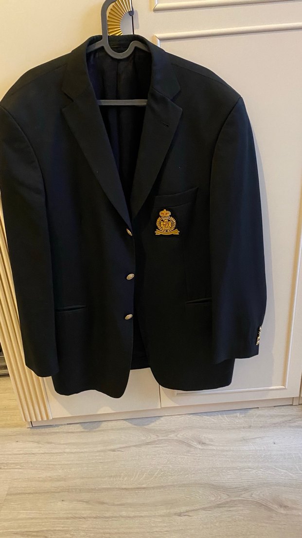 Düğmeli, klasik kesim erkek siyah ceket, uzun kollu ve yakalıdır. Göğüs cebinde altın renk işlemeli amblem bulunur, ofis için uygundur.