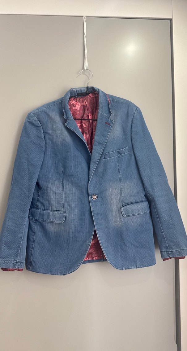 Düğmeli, notched yaka erkek kot ceket. Uzun kollu, parlak mavi renk ve normal boyda, ofis kullanımı için uygun. İç kısmı düzgün astarlı.