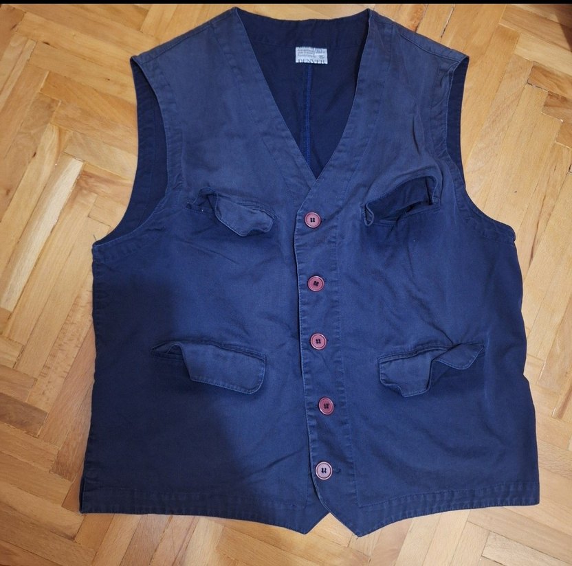 Düğmeli ön kapama, kesik v yaka ve lacivert renkte, erkek kot yelek.günlük kullanıma ideal. arkasinda kemer detayi var ,yelek gobegin altinda bitiyor