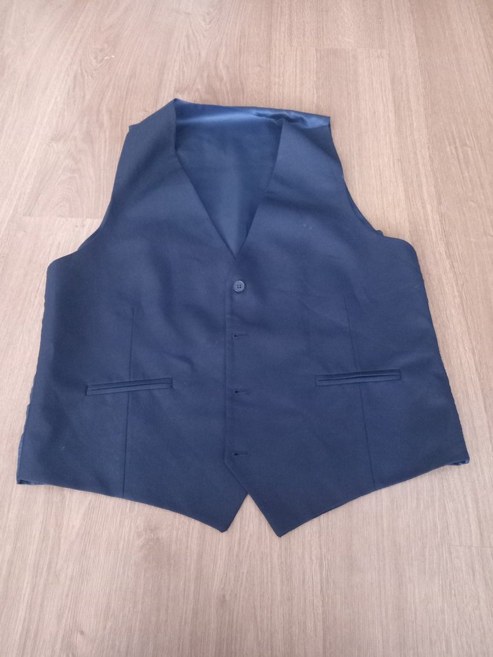 Düğmeli, koyu mavi erkek yeleği, kesik yakalı ve kolsuzdur. Normal kesim, sentetik kumaştan üretilmiş, iş ve günlük kullanıma uygundur.