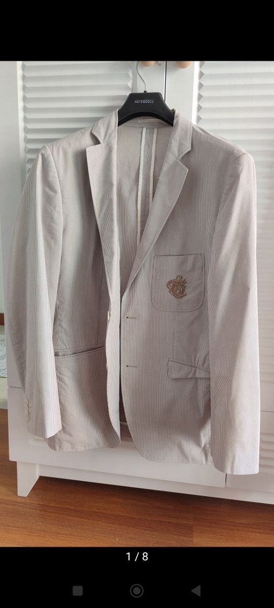 Düğmeli ve normal boyda beyaz erkek ceket, klasik kesim ve uzun kolludur. Göğüs cebinde işlemeli amblem ve yan cepler bulunur. Ofis ve sokak stiline uygundur.