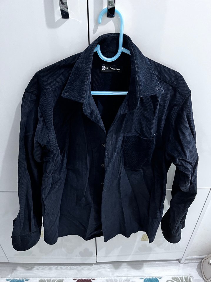 Düğmeli önü, kesik yakası ve uzun kollu erkek ceketi. Yumuşak fitilli kadife kumaştan, bol kesim ve koyu lacivert renkte, günlük rahat kullanım için uygundur.