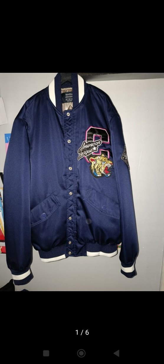 Düğmeli ve uzun kollu, koyu mavi bomber ceket. Notlu yaka ve nakış detaylarıyla rahat ve spor tarzda bir görünüm sunar.
