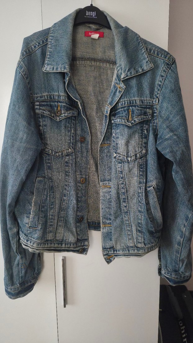 Mavi renkli, düğmeli, uzun kollu, normal boyda, bol kesim erkek denim cekettir. Notlu yaka ve gündelik sokak stiline uygundur.