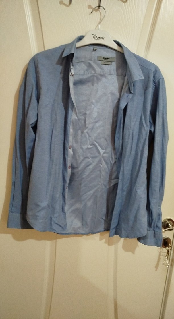 Erkekler için uzun kollu, düğmeli mavi denim gömlek. Notlu yaka ve normal kesim ile günlük rahat sokak stili için uygundur. Desensiz ve gri tonlarında.