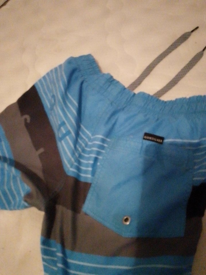 12. yaş. mavi ve gri renk tonlarında, düğmeli cep ve lastikli beli olan bol kesim erkek yüzme şortu. Plaj ve rahat athleisure stil için uygundur.