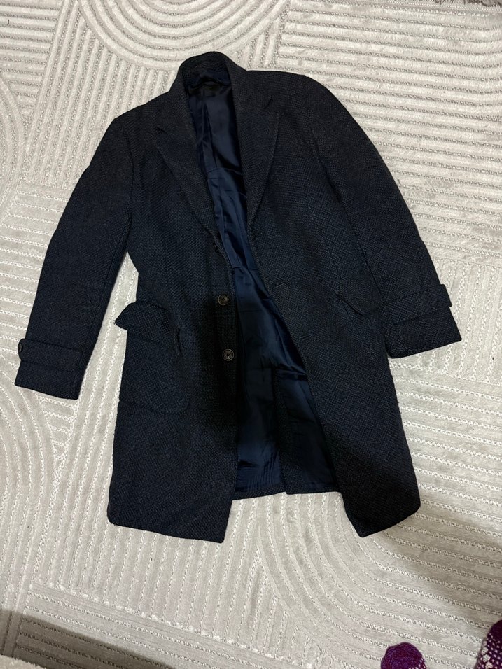 Düğmeli, midi uzunlukta erkek kaban. Notch yaka, uzun kollu ve sentetik kumaştan üretilmiştir. Ofis ve günlük kullanıma uygundur.