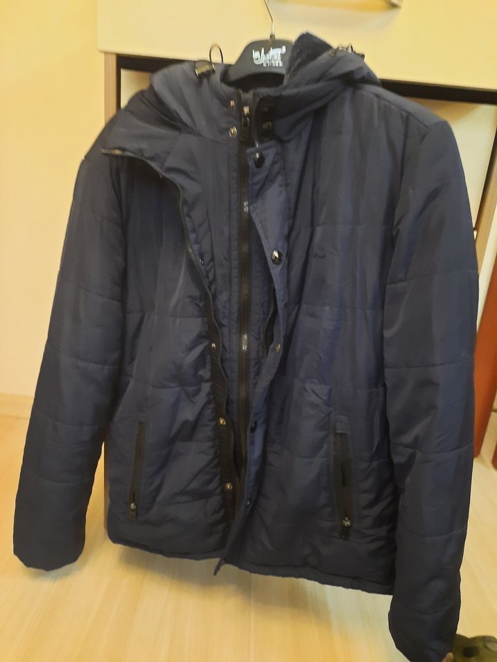 Düğmeli, normal midi boy, regular kesim erkek ceketi. Uzun kollu, lacivert renkte, yumuşak ve sıcak kumaştan, desen içermeyen sokak stili ceket. kucuk bir delik var şapkasını da birde citin birinin ici düş muş