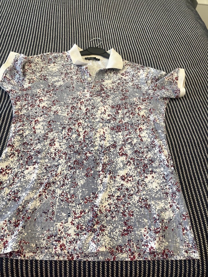 Düğmeli, yakalı ve kısa kollu bu erkek polo tişörtü, gri ve bordo tonlarında batik desene sahiptir. Günlük kullanıma uygundur. Çok az giyilmiştir  Ayşe dolabımda buna benzer çok fazla erkek giyim mevcuttur bir bakmanızı rica ederim