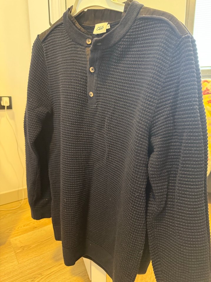 Süet detaylı Düğmeli yakalı uzun kollu, lacivert erkek kazak. Rahat ve normal boyda, günlük giyim için uygun. İç etiketi biraz şey olmuş onun dışında herhangi bir sıkıntı yok yeni gibi gözüküyor. Orijinal Beymen club marka