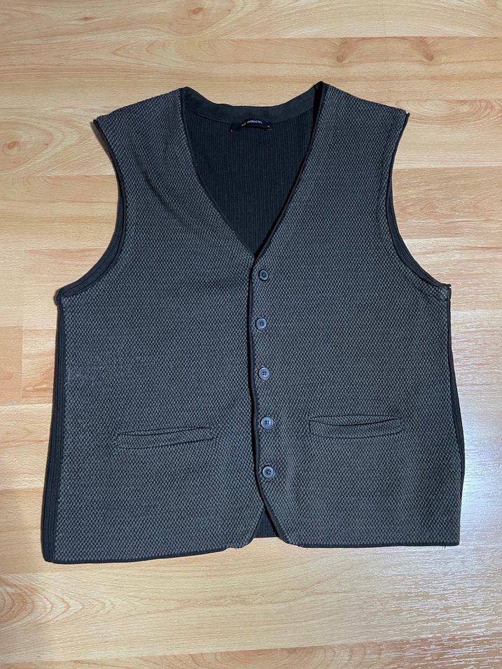 Düğmeli, yakalı ve kolsuz gri erkek yeleği. Sentetik kumaştan, rahat kesim ve normal boyda, günlük sokak stili için uygundur. M-L bedenlere olur ölçü ekledim hafif önde tülerme var temizlenir bir de siyah var tudorsun