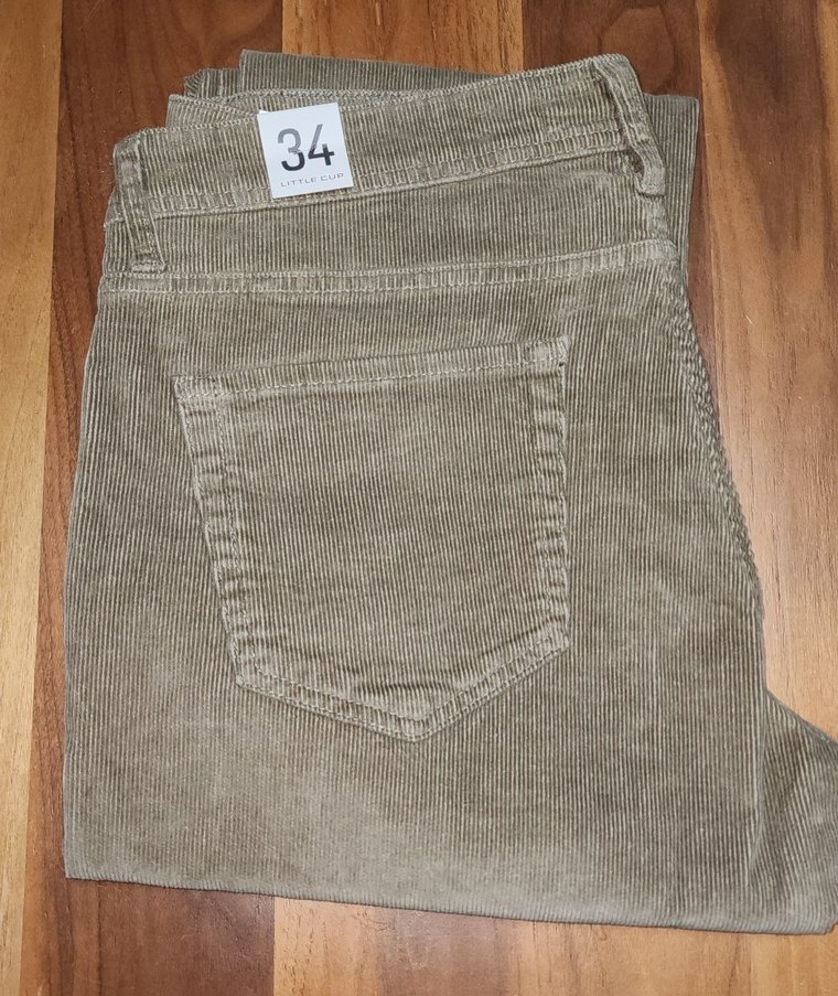 Düğmeli, bej süet kumaştan yapılmış, regular fit erkek pantolonu. Günlük sokak stili için uygundur. Beden 34.