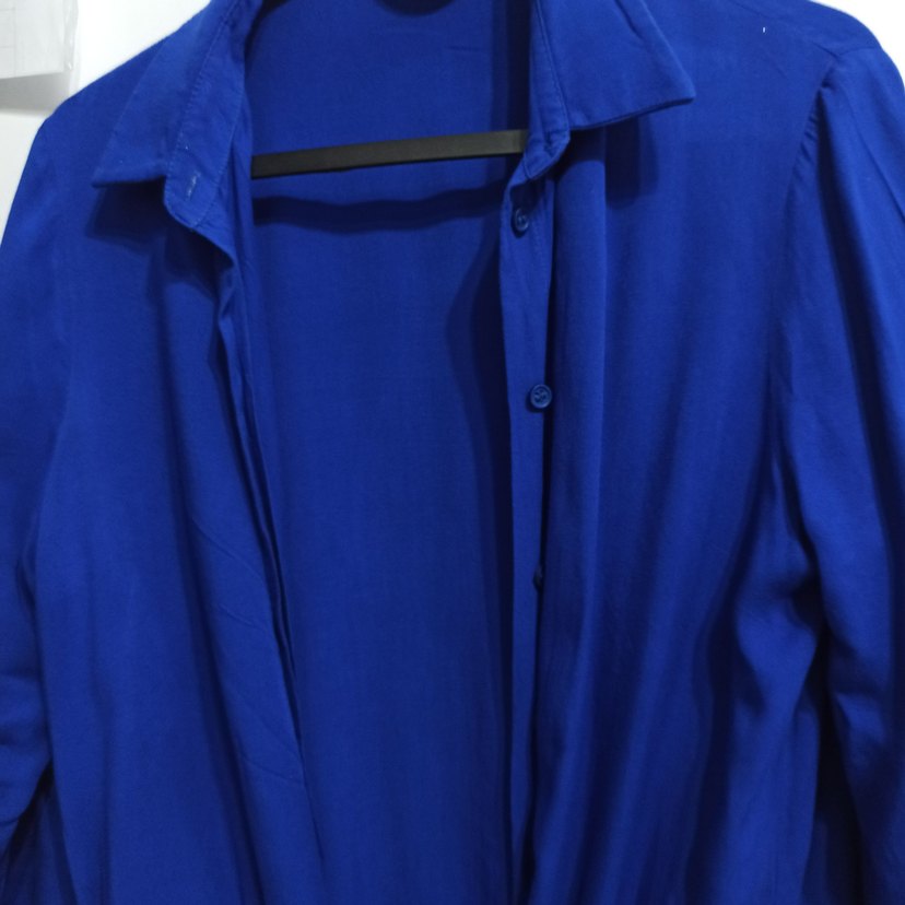 Düğmeli, yakalı ve uzun kollu bu koyu mavi kadın gömleği, gevşek kesim ve ipeksi dokusuyla ofis ortamı için uygundur. m beden yazlık yumşacık, rahat bagcikli