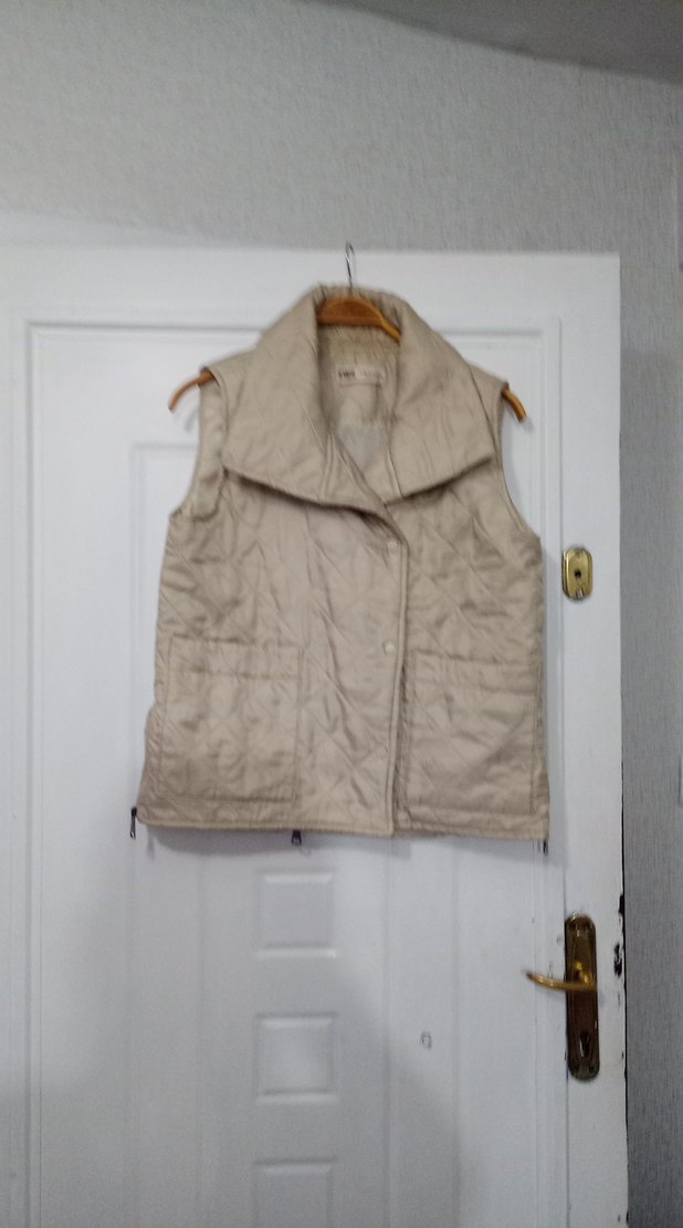 kumaştan yapılmış, düğmeli, bej renkli kolsuz yelek. Kısa boylu, regular fit ve yakalı tasarıma sahip, günlük kullanıma uygun minimalist model.