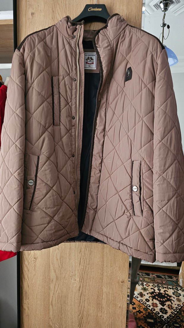 Düğmeli ve çıtçıtlı kapamalı, kahverengi erkek mont. Normal boyda, uzun kollu ve düz desenli. Rahat kesimli ve sentetik kumaştan üretilmiştir.
