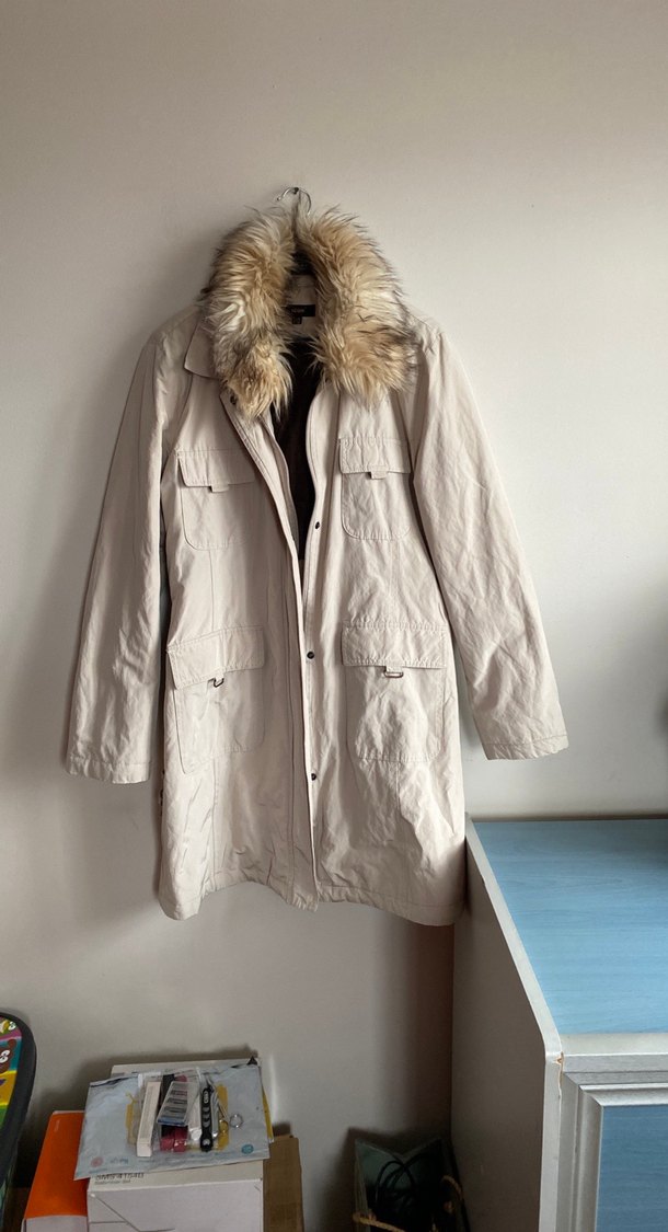 Bej renkli fermuarlıdüğmeli midi kaban. Keten kumaştan, uzun kollu ve düz kemerli Günlük ve rahat sokak stili için uygun. Ayrıca astarın beden bölümü miflönlü soğuktan korur.