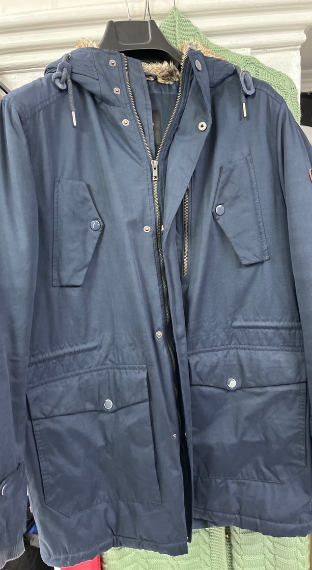 Lacivert denim erkek ceket, düğmeli ve uzun kolludur. Normal kesim ve midi boyda olup, günlük dış mekan kullanımı için uygundur.