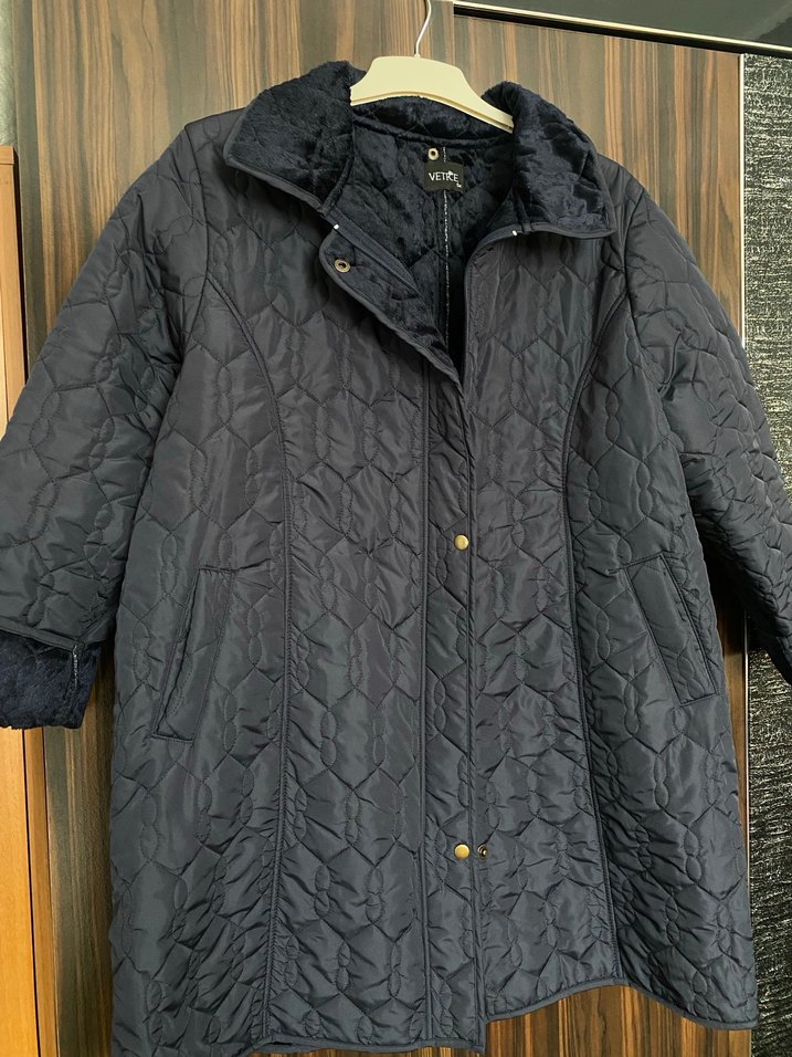 Düğmeli ön, kesik yakalı, içi yünlü uzun kollu lacivert kadın midi mont. Beden 54 fakat 48 beden ve sonrası için de uygundur kalıbı dar.Rahat kesim ve yumuşak sentetik kumaştan, gündelik kullanım için uygun.