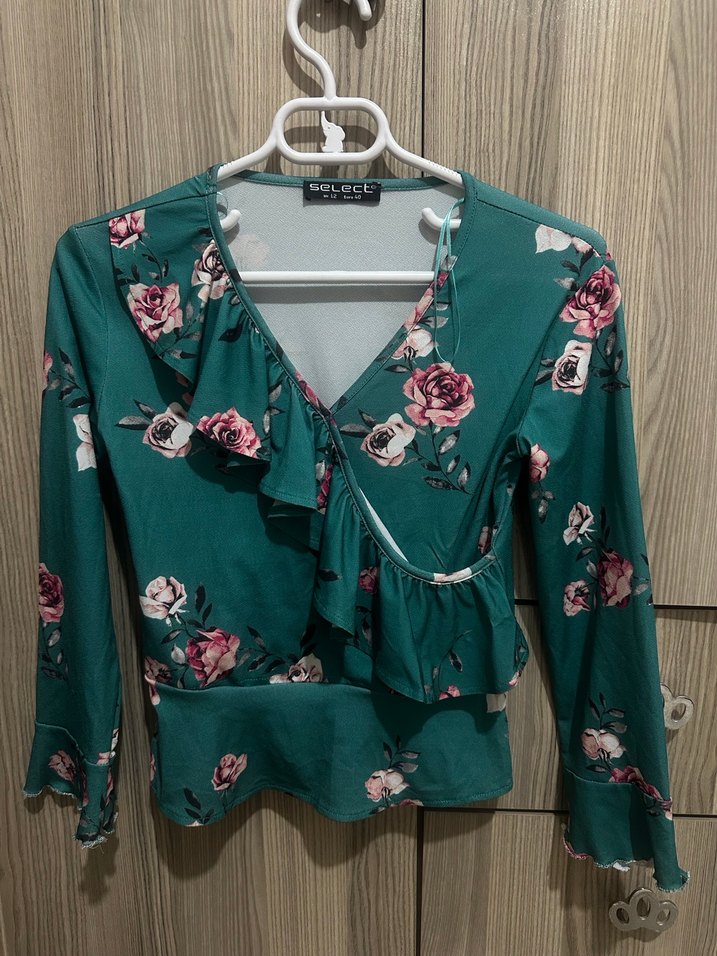 Uzun kollu, V yakalı ve kısa kesim yeşil bluz, çiçekli baskı ve fırfır detaylarına sahiptir. Sentetik kumaştan üretilmiş, günlük kullanıma uygundur.