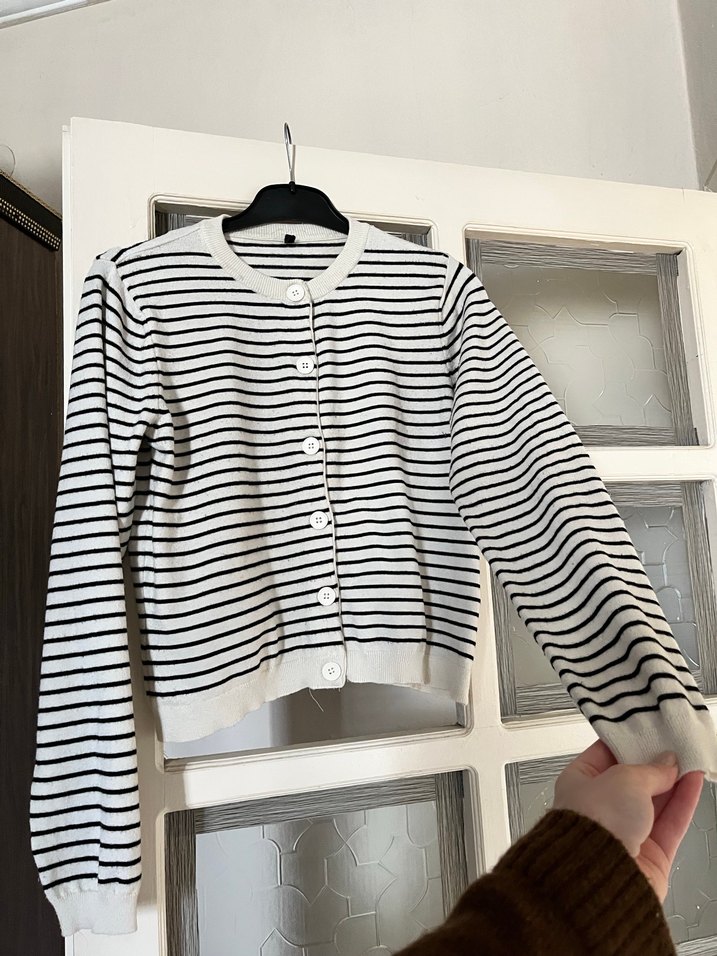 Pamuk kumaştan, düğmeli, uzun kollu ve bisiklet yaka olan bu fit kesim kadın hırka, beyaz zemin üzerinde gri çizgilidir. Sokak stiline uygundur.