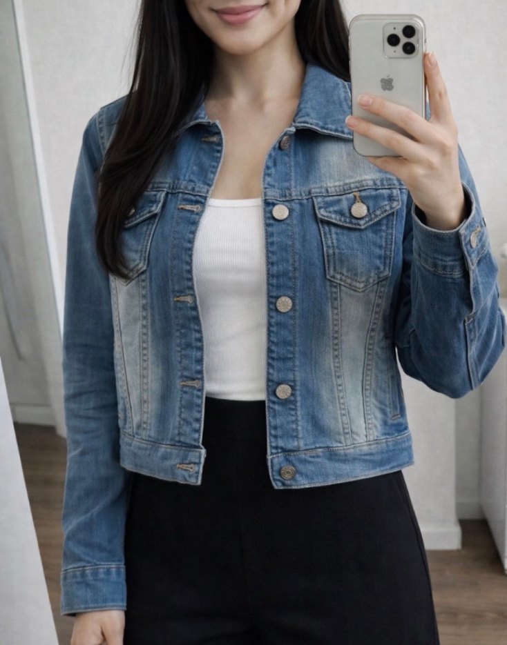 Düğmeli önü ve uzun kollu yapısıyla fit kesim kot ceket. Normal boyda, kesik yaka detayıyla günlük ve rahat sokak stiline uygun. M beden yazıyor ama S beden giyen biri için daha uygun. Bi iki defa ancak kullanıldı çok temiz. Hiçbir sorunu yok.