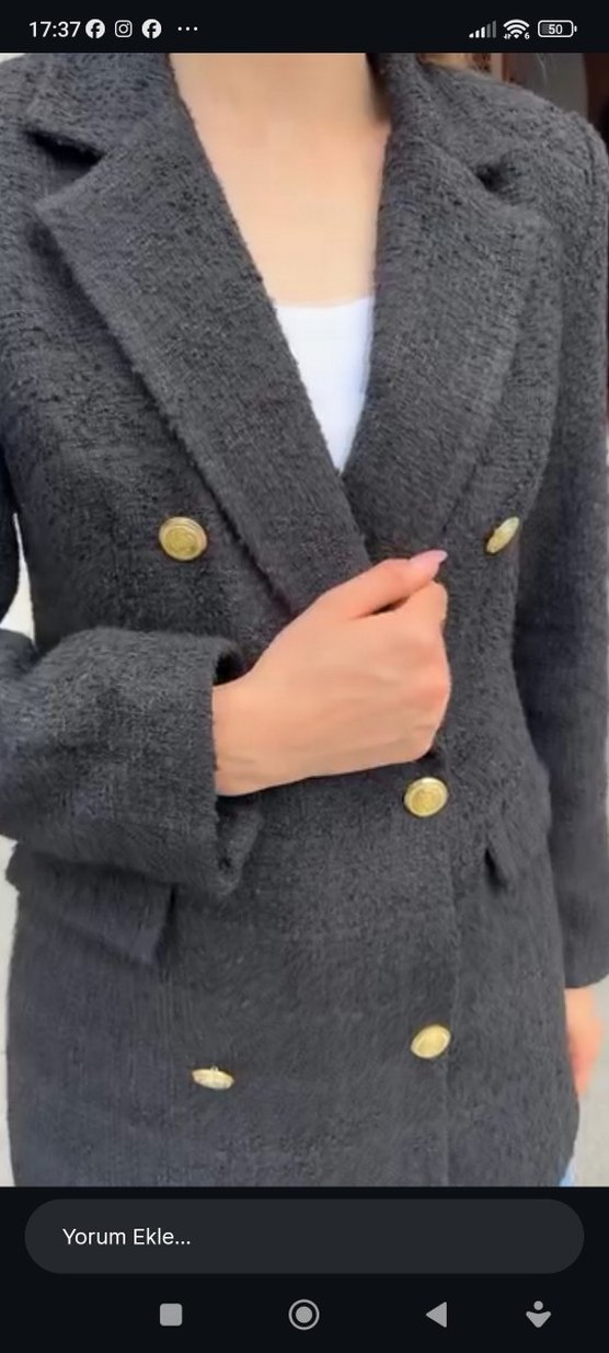 fumei renkli, yün kumaştan yapılmış, düğmeli ve yakalı midi uzunluğunda kadın blazer ceket. Ofis için uygun, regular kesim ve uzun kollu.