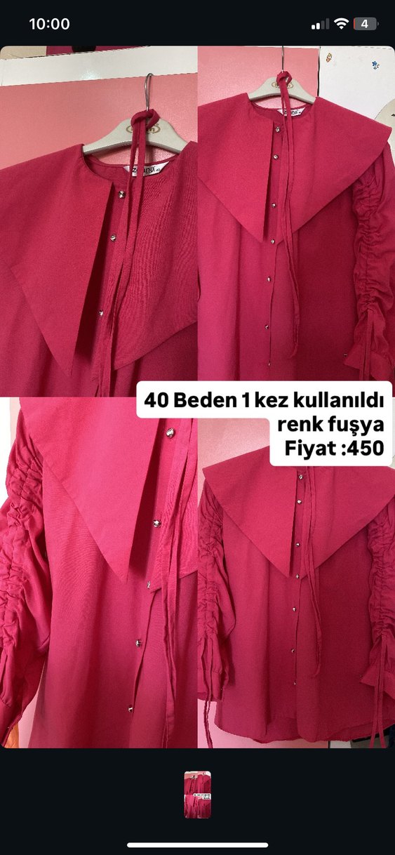 Düğmeli, uzun kollu, salaş kesim fuşya midi tunik. Sentetik kumaştan, baskılı ve tek kullanılmıştır. Günlük ve iş tarzına uygun.