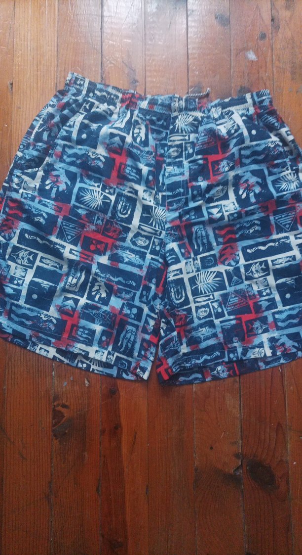 Düğmeli, gevşek kesim erkek şort, koyu mavi tie-dye desenli, plaj için uygundur.