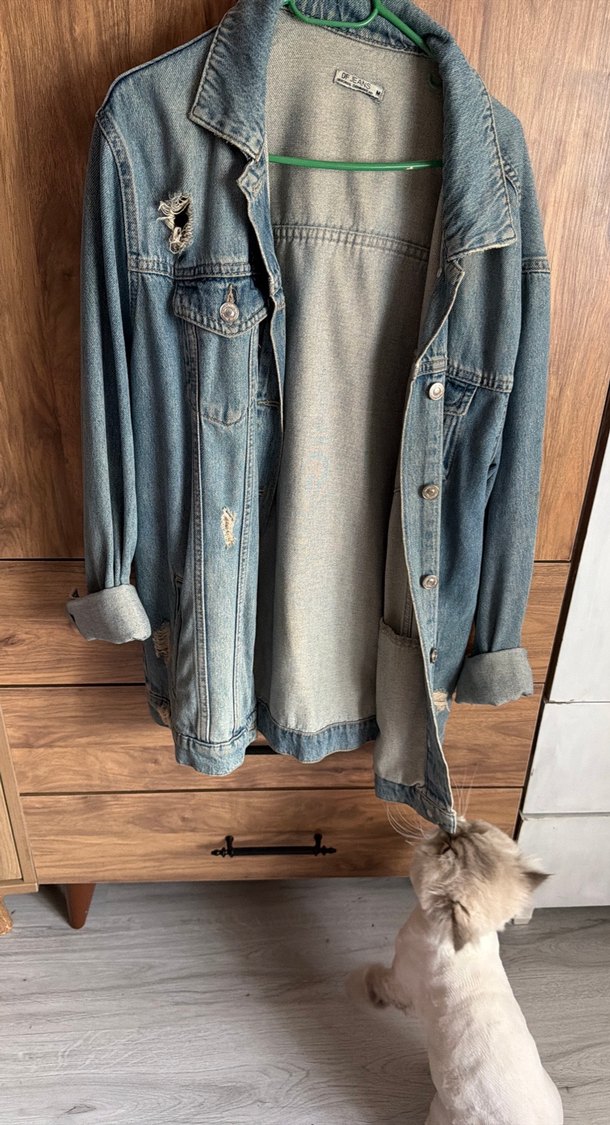 Bu kadın kot ceket, gevşek kesim ve düğmeli kapama ile notched yaka ve uzun kollara sahiptir. Mavi tonunda, hafif yıpranmış görünümlü, günlük rahat sokak stili için uygundur.