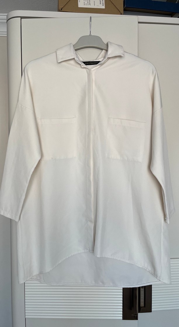 Düğmeli krem ya da kırık beyaz gömlek, yakalı ve uzun kolludur. Bol kesim ve midi boyda, günlük kullanıma uygundur. En üst düğmesi yoktur.