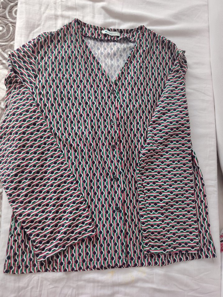 Düğmeli ön kısmı ve V yakası olan, uzun kollu, bol kesim kadın üst Çok renkli geometrik desenli, yumuşak sentetik kumaştan üretilmiştir. Günlük kullanım için uygundur.