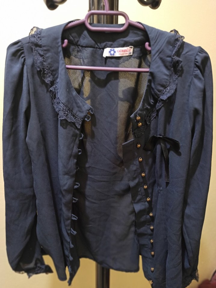 Düğmeli, uzun kollu, siyah gotik kadın gömleği. Notch yakalı ve dantel detaylı, midi boyda, sentetik kumaştan üretilmiştir. Ofis kullanımı için uygundur.