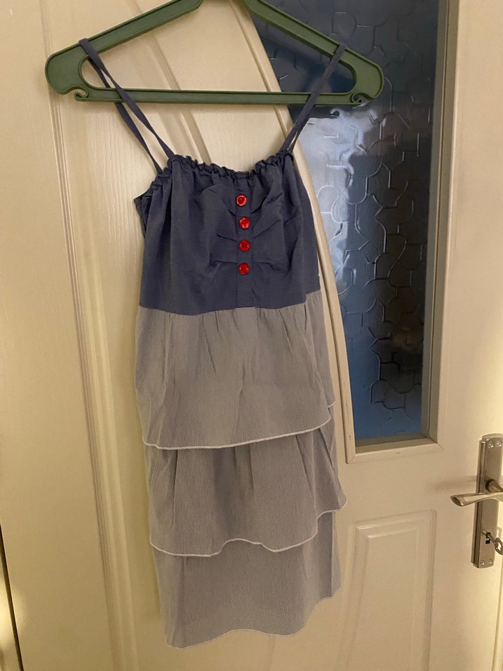 Gri renkte, düğmeli askılı elbise. Kat kat midi boy, bol kesim ve bohem tarzıyla günlük kullanıma uygundur.