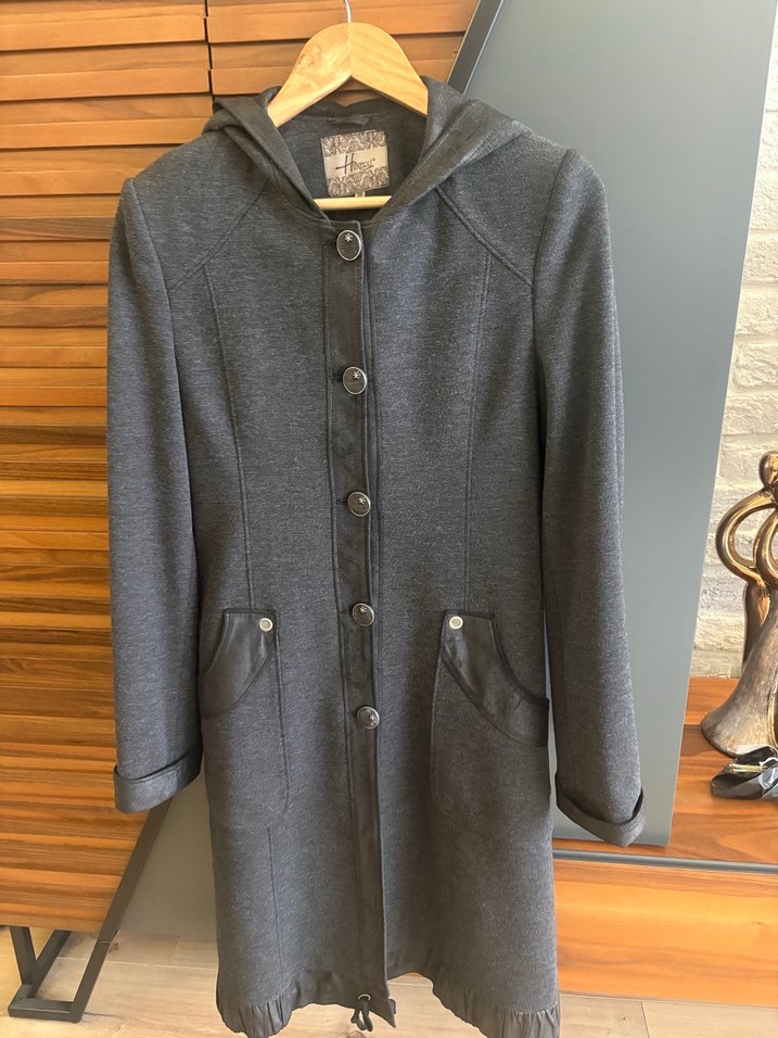Gri renkte, düğmeli ve kesimli yakalı baharlık ceket Uzun kollu, midi boy ve rahat kesimdir, yumuşak ve sıcak kumaştan yapılmıştır.