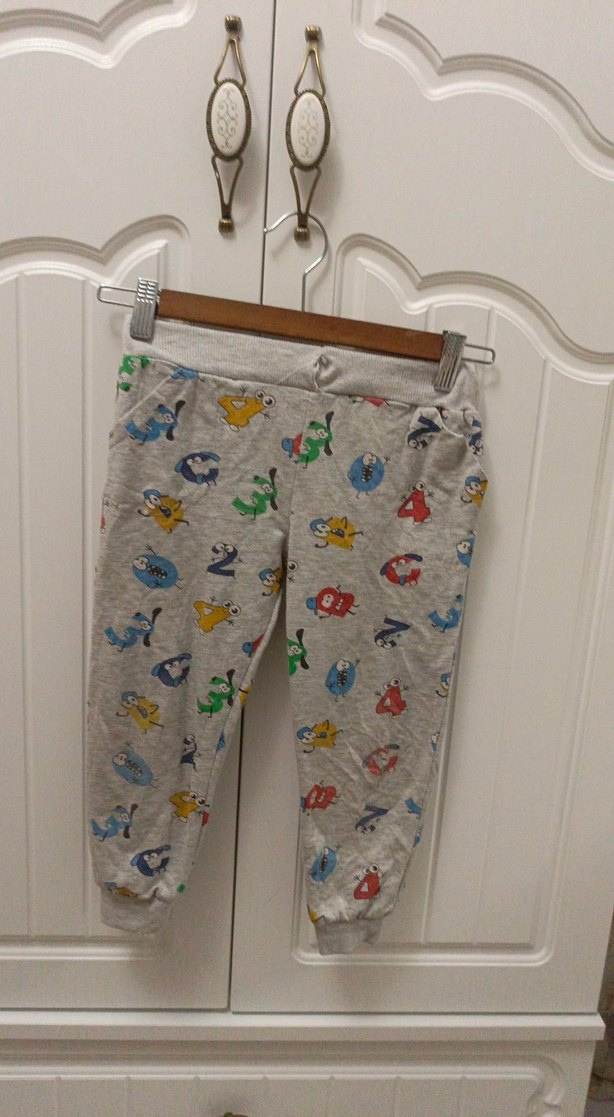 Rahat kesim, düğmeli beli ve renkli baskılı desenleriyle gri erkek çocuk eşofman altı. Yumuşak ve sıcak kumaştan üretilmiştir.