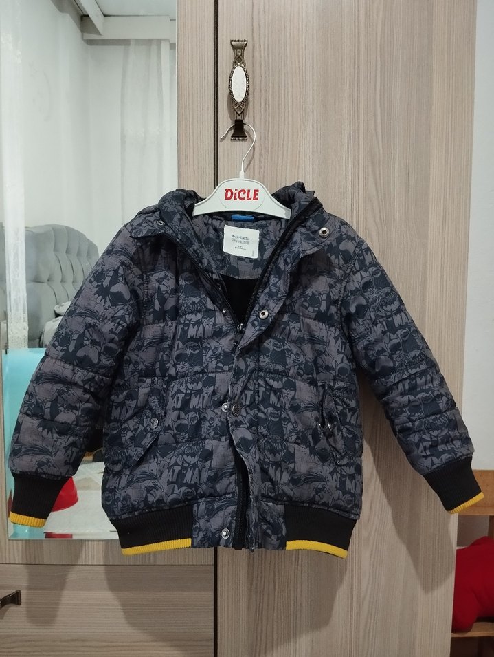 Düğmeli, baskılı desenli, bol kesim erkek çocuk montudur. Yumuşak ve sıcak kumaştan üretilmiştir, notched lapel yakaya sahiptir.