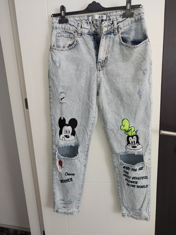 Gri renkli, baskılı çizgi film desenli, düğmeli, bol kesim kadın denim jean. Günlük kullanıma uygun rahat sokak stili jean.