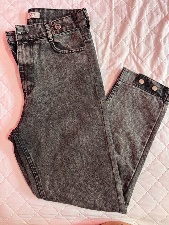 Gri batik desenli, düğmeli denim kadın jean. Normal uzunlukta ve regular fit, günlük sokak stili için uygun.