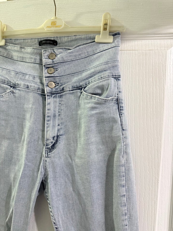 Düğmeli önden kapanışlı, batik desenli gri kadın kot pantolon. Günlük kullanıma uygun, rahat ve trend kesim.