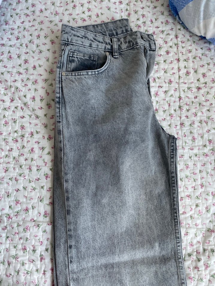 Gri kot kumaştan, düğmeli ve batik desenli, bol kesim kadın kot pantolon, günlük rahat sokak stili için uygun.