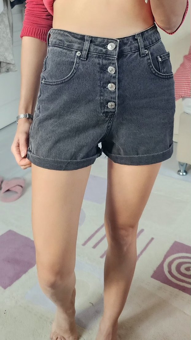 Düğmeli Gri Batik Desenli Kadın Kot Şort