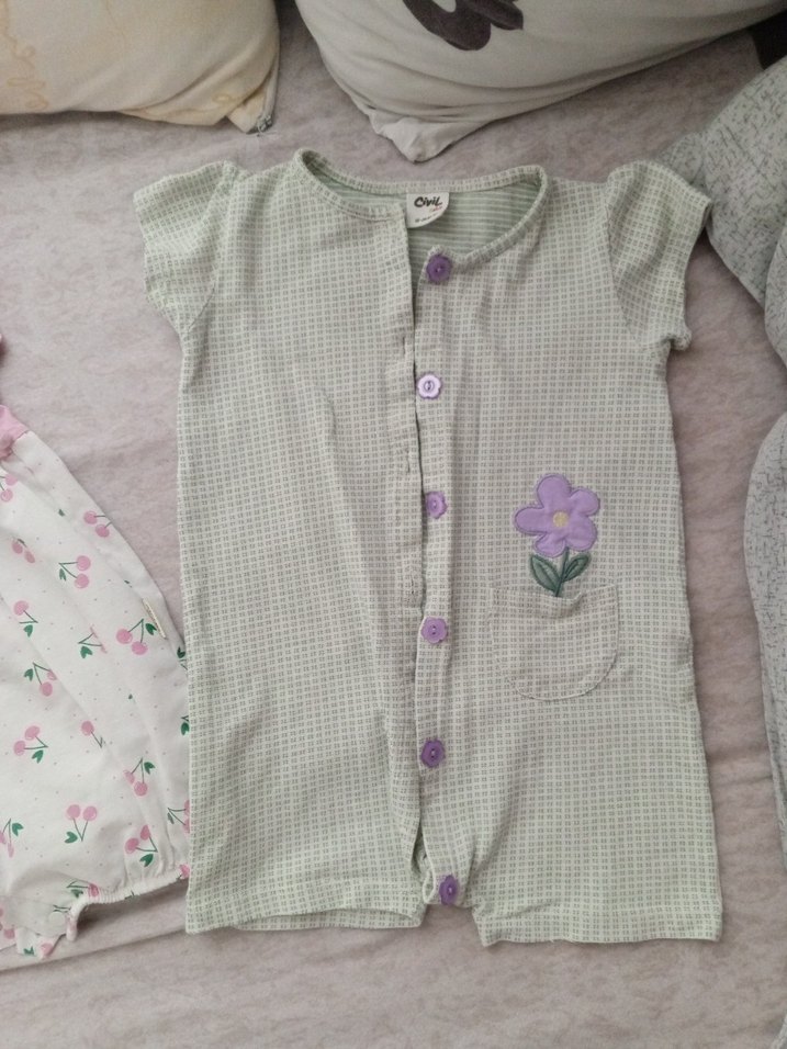 Düğmeli, pastel gri renkli bebek kız tulumu, işlemeli çiçek detayı ve küçük cep içerir. Yumuşak ve rahat kumaşlıdır.