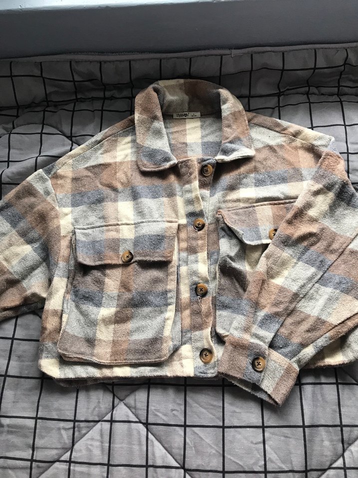 Düğmeli Gri Bej Kareli Kadın Gömlek