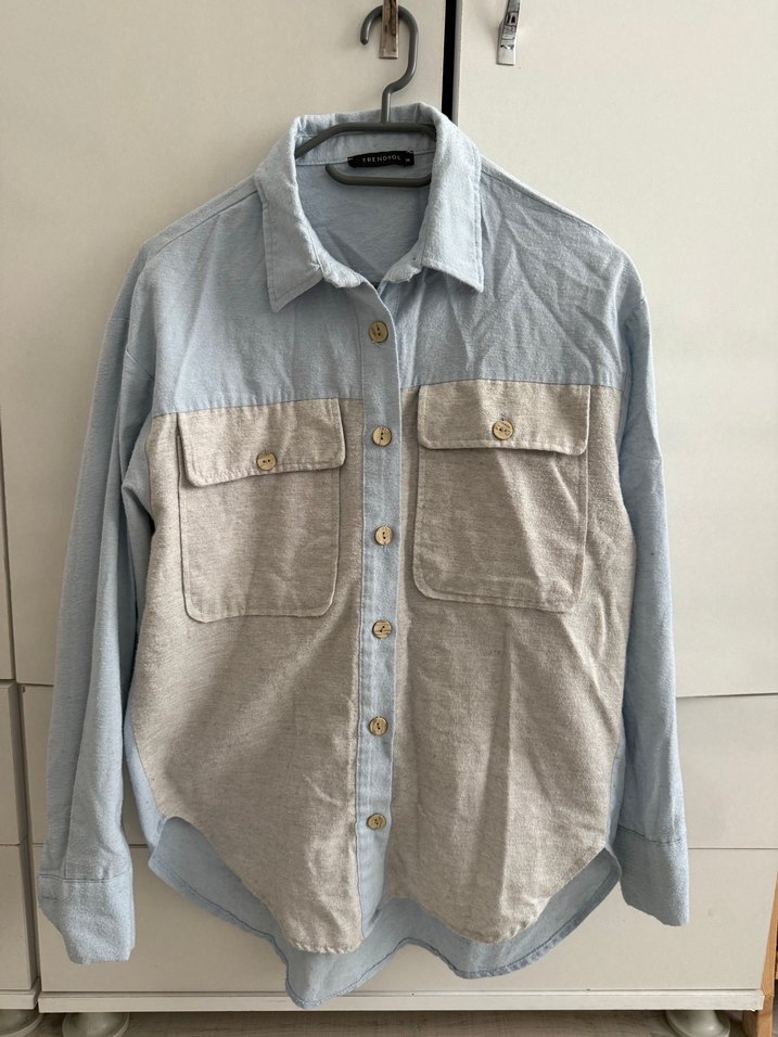 Gri ve bej tonlarında, düğmeli, cep detaylı, uzun kollu ve yakalı bol kesim kadın denim gömlek. Sokak stili ve günlük kullanım için uygun.